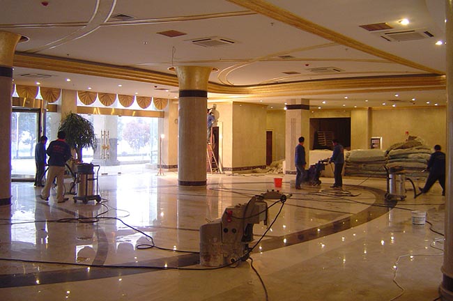 石材翻新護理方法/步驟一、施工前準備1、人員分組進入指定地點;2、設備材料按要求進入現場;3、人員分項分組;4、人員佩戴防護設備;5、將現場施工范圍清理推去灰塵。二、現場保護程序1、人員每兩人一組,現場主管一名,設備材料準備,美紋紙,刀片,保護膜;2、將保護膜沿地腳線邊角包裹墻面40公分;3、用刀片將保護膜切斷拉平拉直;4、采用美紋紙將保護膜黏貼住,使其不脫落;5、地腳線下面一定貼緊地面。三、石材無縫處理(修復)及防護程序1、石材無縫處理:1.1、將石材開縫機裝配厚度適中的開縫片,接入水源;1.2、石材開縫機順石材接縫按一定深度均勻行走;1.3、自留水管跟開縫機行走一邊將切開的接縫進行清洗;1.4、吸水機跟進將切割后殘留的污水等吸凈,特別是接縫內一定洗干凈;1.5、采用強力吹干機將石材快速風干;1.6、按石材顏色將多顏色云石膠調配到石材相近的顏色;1.7、取少許云石膠加入適量固化劑進行拌勻;1.8、用勾縫刀云石膠均勻填補進石材縫隙,填縫時需注意不起泡,膠要填實表面應高出少許以便風干過程..